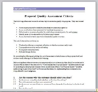 PropLIBRARY Subscribers are welcome to download the criteria and perform their own assessments. If you would like our help in performing the assessment, then contact us and let us know whether you want a formal or informal approach and how many pages worth of material you have. We’ll ask some questions and based on the answers give you a quote. We like doing assessments because it takes fewer hours than writing a proposal for you, and the way it enables your organization to improve its own future effectiveness provides much longer lasting value.
