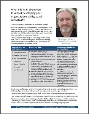 PropLIBRARY is a great tool and we spend a lot of time talking about it. It's perfect for the "Do It Yourself" types. But when you need guidance from a real live person or some hands on help you need a consultant and not just a tool. Carl Dickson is the founder of CapturePlanning.com and PropLIBRARY. He is also a trainer and consultant. Here is a description of what he does as a consultant so you can see if we're a match. Feel free to download and send it to others you think could use some he- 0 comments