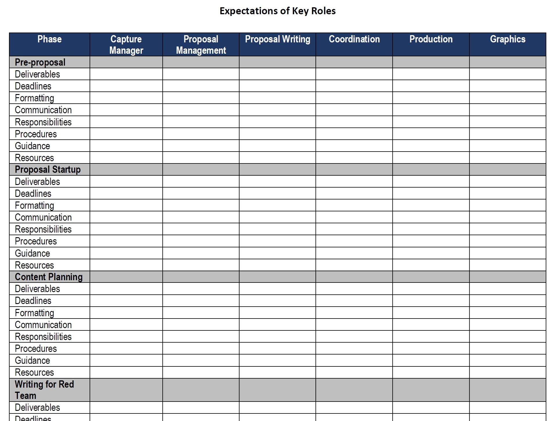 This matrix enables you to quick document what is expect of each role supporting a proposal through each phase of proposal development. When you view across the roles you can see how the team works together to accomplish each phase.